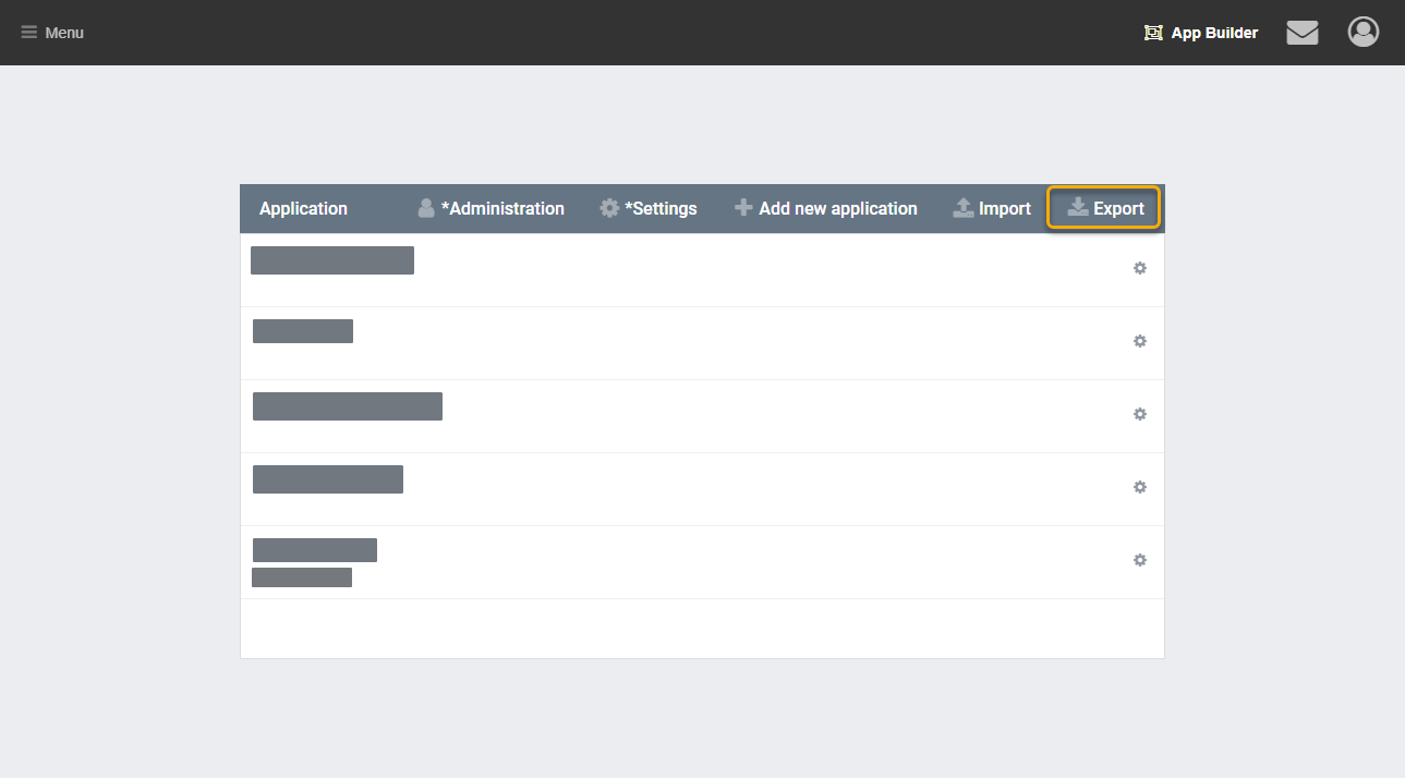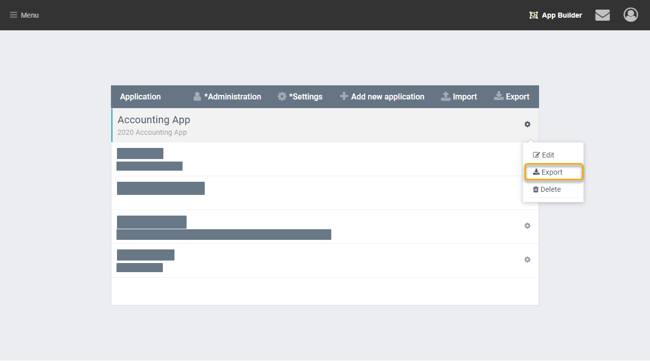 Alternatively a Single App can be exported (here referred to as app.json). From AppBuilder select the cog beside your app. Then click export from the menu.