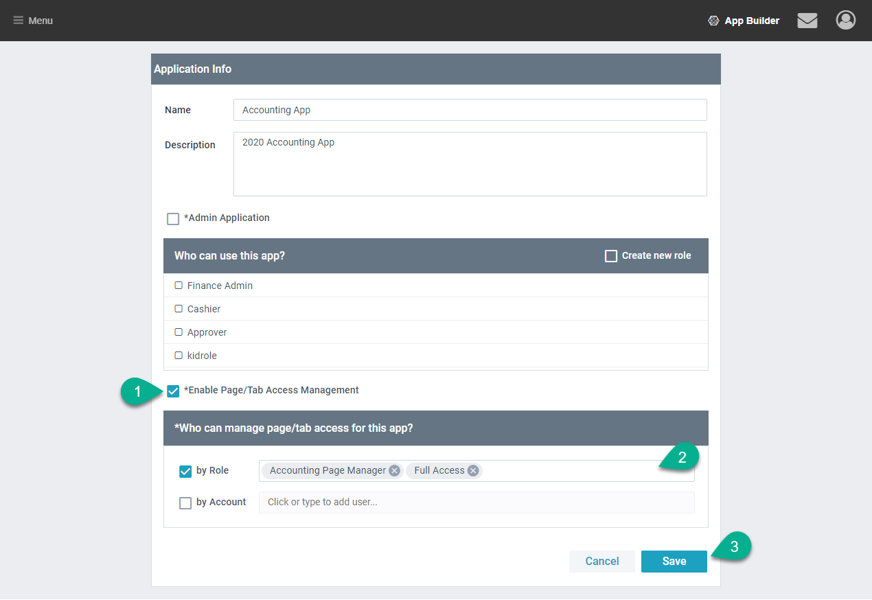 - Select by Role and add the Builder Role (‘Full Access’ on Trial). If any other role or account should be able to manage page access add them too.
