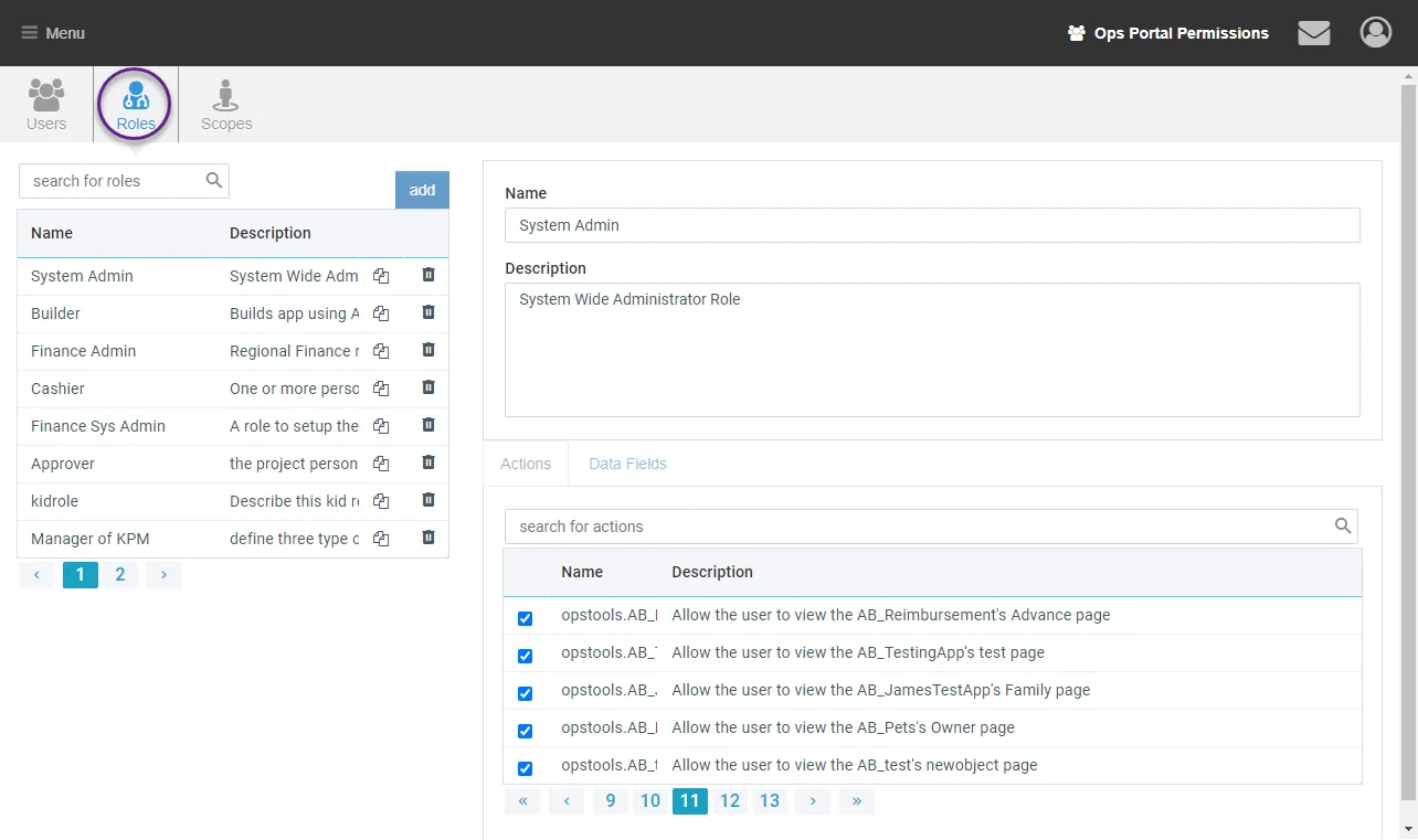 AppBuilder roles can be used with the Access Page Manager to set fine grained access permissions down to any page or tab. They can also be assigned Scopes which limit the data the user can see.
