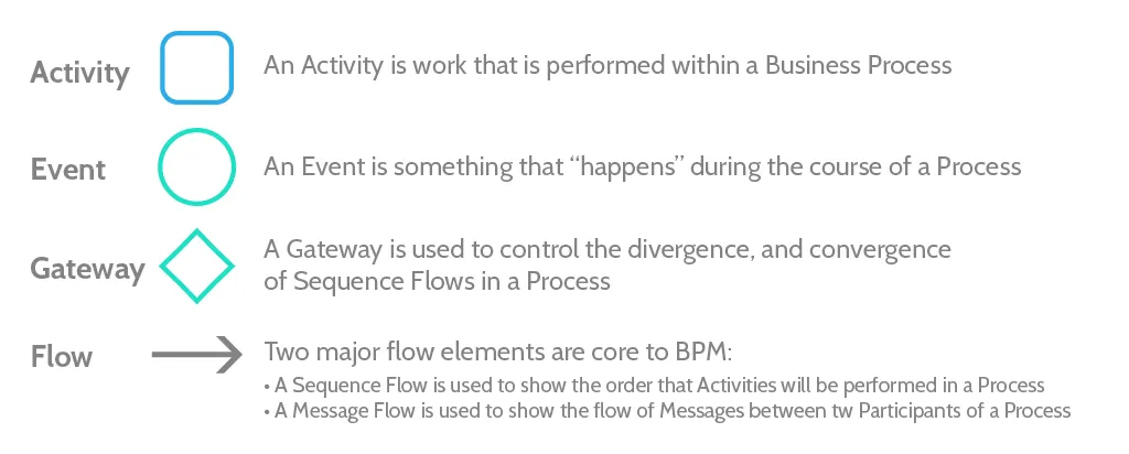 The Process Manager uses bpmn notation format. The main elements are represented using these shapes: