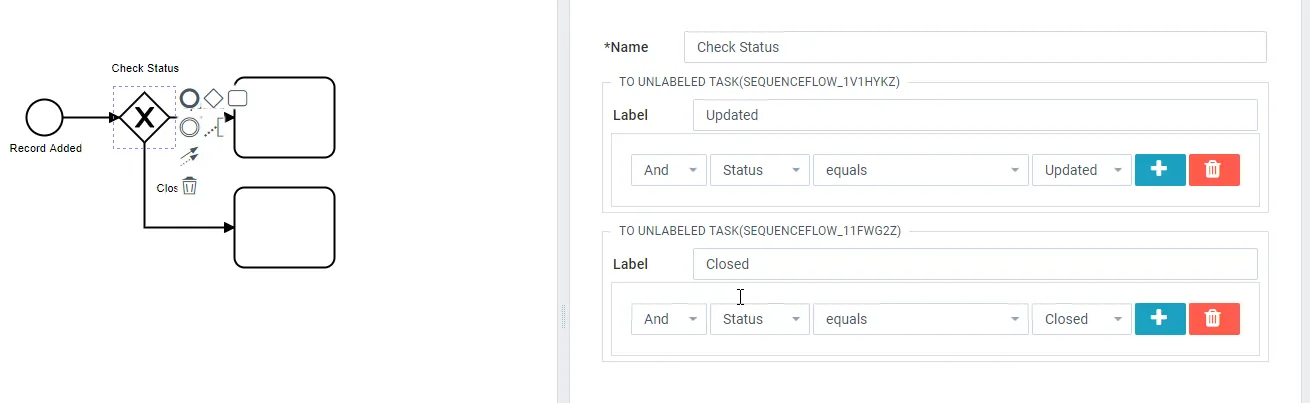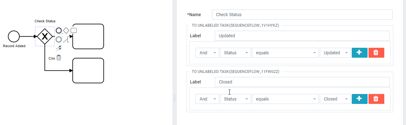 Gateways are used to split the process based on a condition. Before configuring a gateway you should add at least two paths from your gateway. Then you can go back and add a condition for each path.