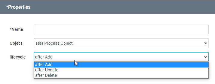 In the Properties Panel add a name that describes the trigger (this will show up as a label under the start event) Select the object and the action that starts the process.